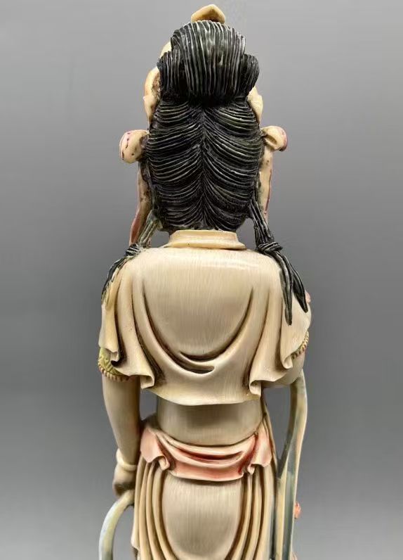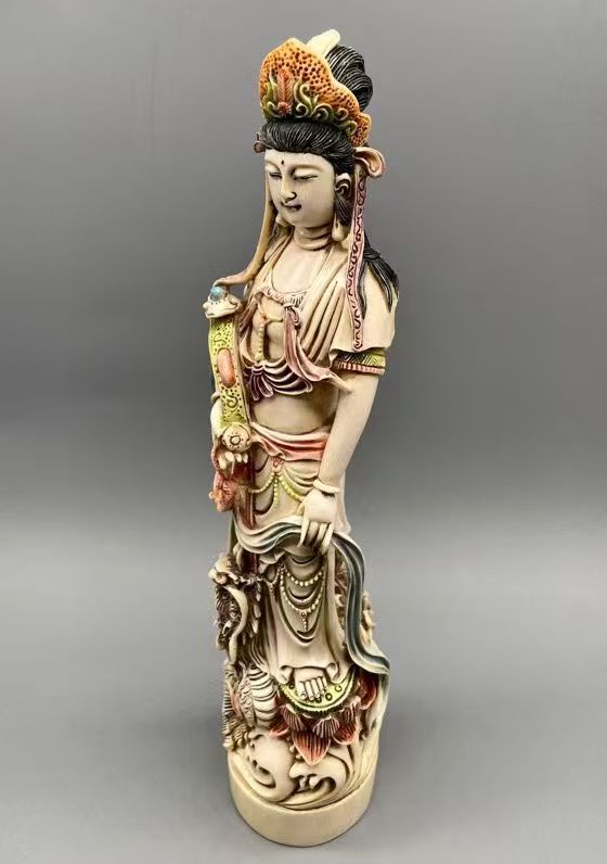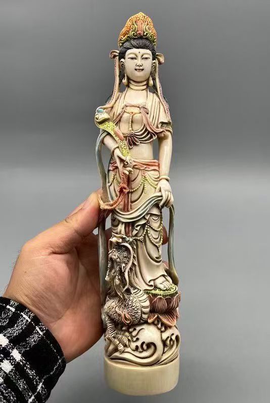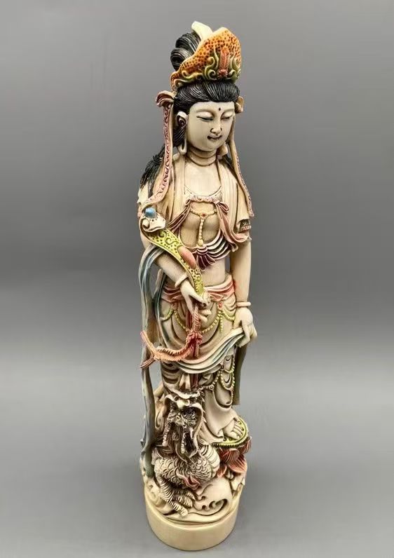 This handcrafted mammoth ivory Dragon Guanyin statue showcases flowing lines, lifelike details, and a serene expression. Expertly carved by a master artisan, it embodies grace and spiritual power. Measuring 27.5 × 6.8 cm and weighing about 690 g, it’s a meaningful piece symbolizing protection and good fortune.