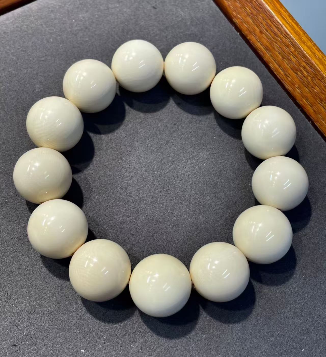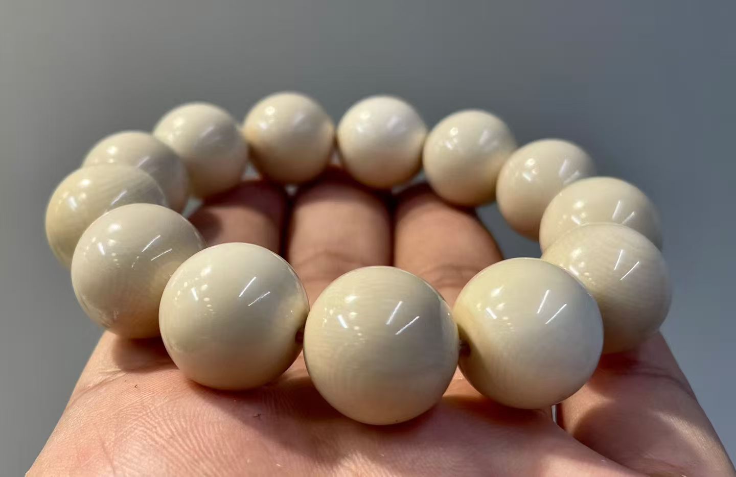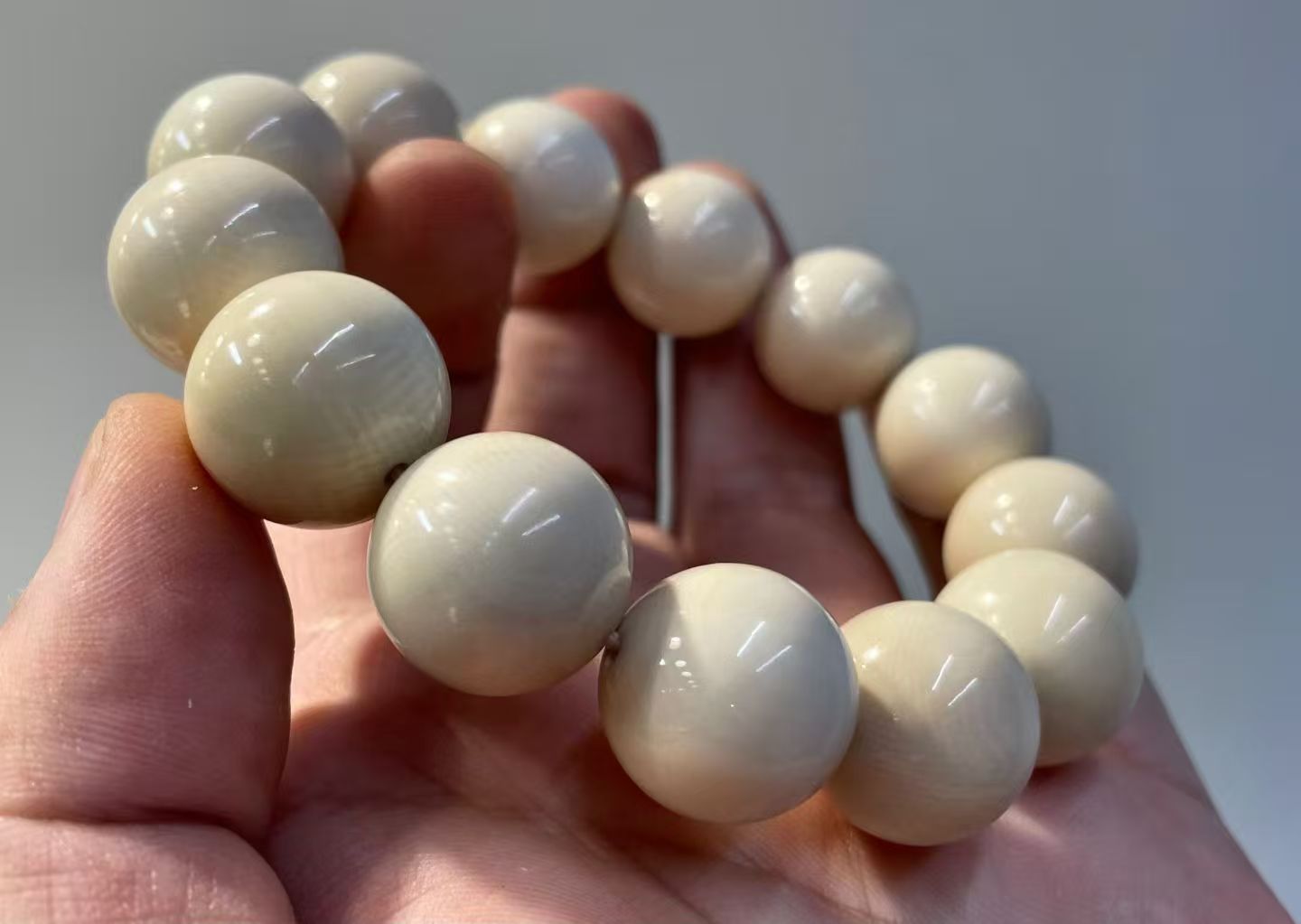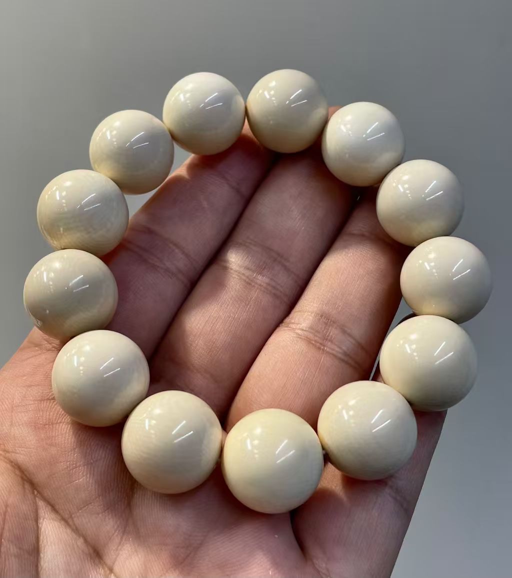 This bracelet is made from premium mammoth ivory with a smooth, icy translucence and clear natural grain throughout. Each bead is carefully selected and precisely matched, offering excellent consistency and a refined, substantial feel. High-grade material of this size has become increasingly rare on the market.Bead size: approx. 18 mm. Total weight: about 62.5 g.