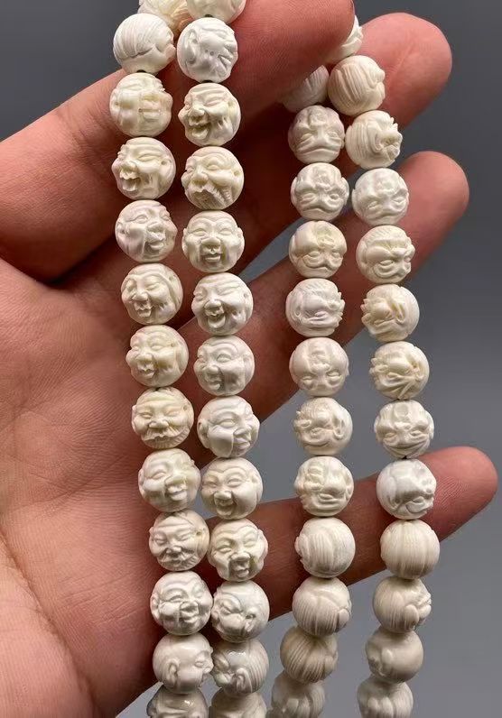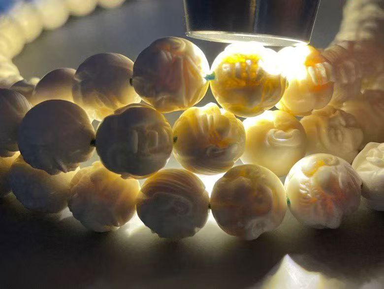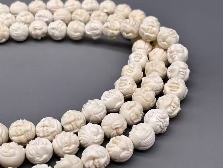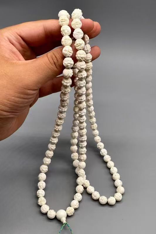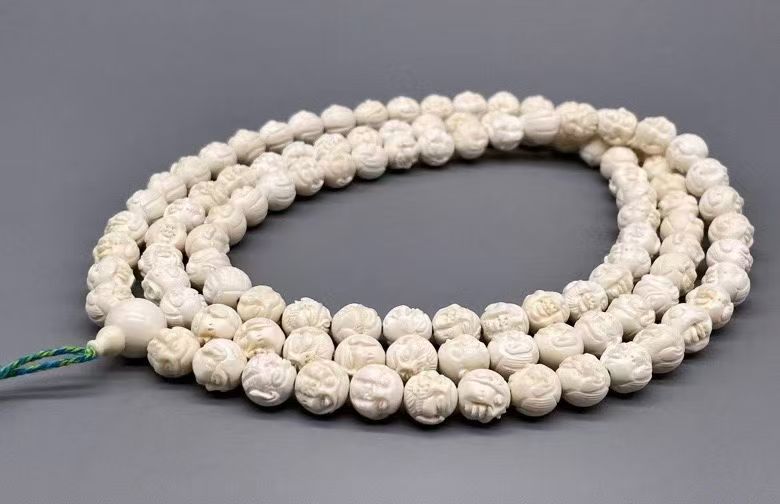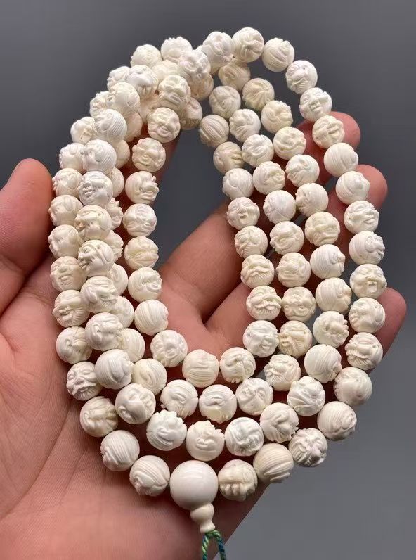 This exquisite necklace features 108 hand-carved mammoth ivory beads, each 10 mm in size and weighing about 85 g in total. Crafted from full-pattern ice-grade ivory, every bead is vivid, detailed, and perfectly rounded. A simple yet elegant piece that reflects exceptional craftsmanship and timeless charm.