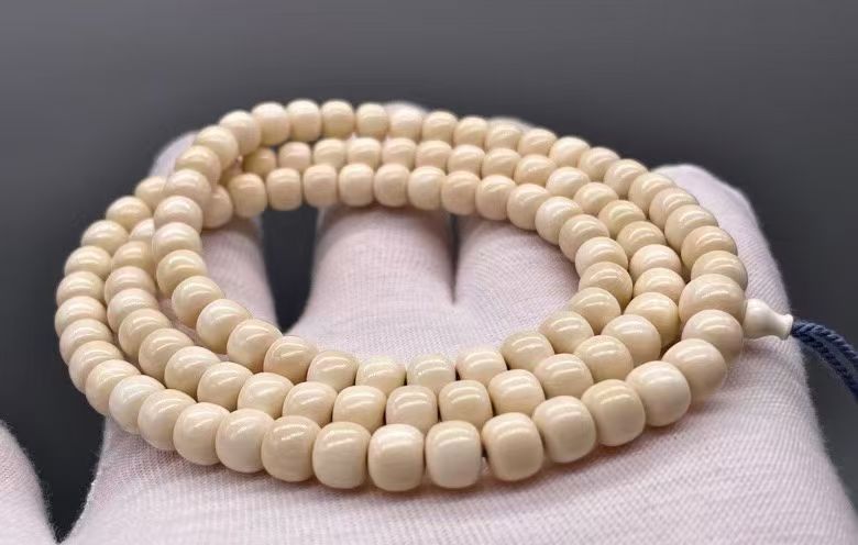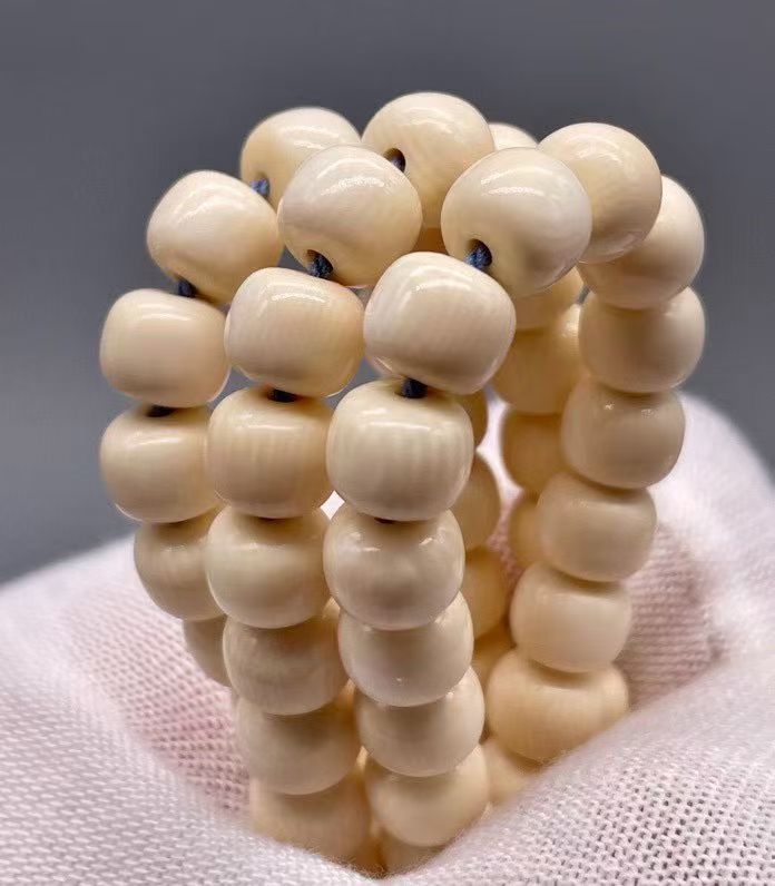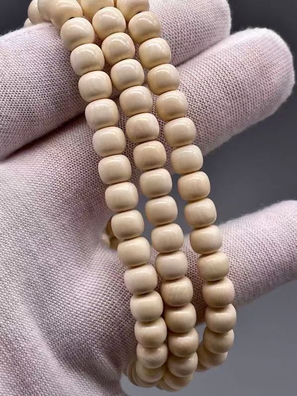 This bracelet is made from rare high ice-grade mammoth ivory, weighing about 33 g with 7×6 mm smooth, full-pattern beads. The natural ivory texture is delicate and lustrous, with each bead perfectly matched. A true luxury piece as raw materials become increasingly scarce.