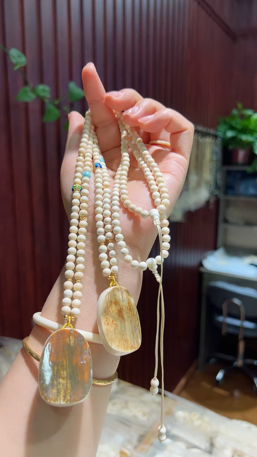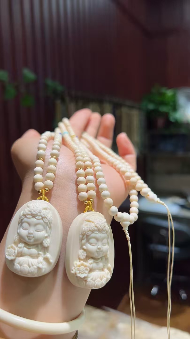 This elegant Green Tara pendant set is hand-carved from smooth, lustrous mammoth ivory. The pendant measures about 28×38×14 mm with 5 mm beads, offering a serene and refined presence. A meaningful piece symbolizing protection, compassion, and blessings — perfect for daily wear or gifting.