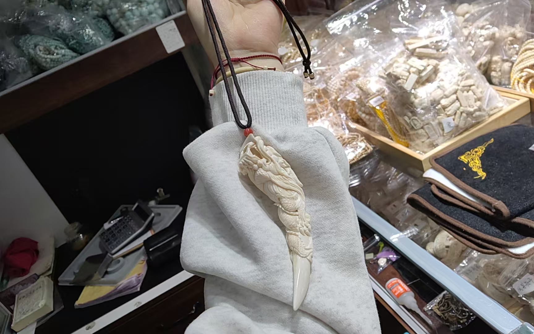 This set includes two authentic hand-carved mammoth ivory pendants: one original tusk-skin pendant carved by renowned master craftsman Li Jinzhì (91 × 43 × 25 mm, 92.1 g), and one hand-carved mammoth ivory tusk tip pendant (23 × 107 mm, 33.2 g). Both pieces are solid, natural mammoth ivory with strong presence and collectible value.