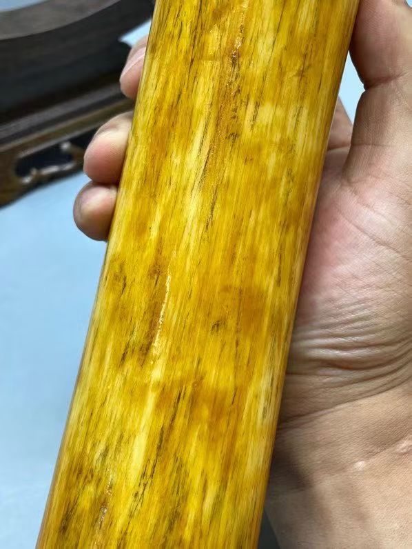 A stunning handcrafted mammoth ivory tusk with rich golden tones formed naturally by minerals over thousands of years. The original skin has been finely polished, revealing clear natural grain and beautiful curvature. Measuring 62cm in arc length, 5.6cm in diameter, and weighing 1800g, this piece is exceptionally rare and perfect for collectors seeking elegance and good fortune.