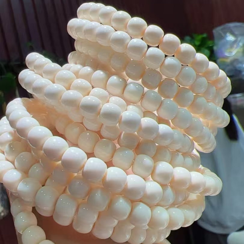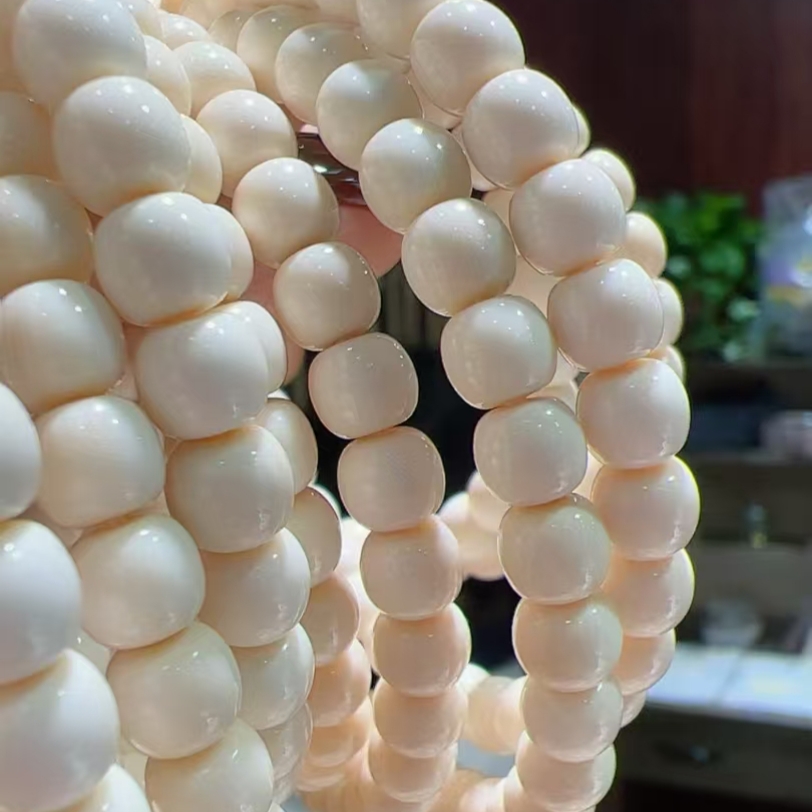 This bracelet features rich and smooth mammoth ivory, crafted in a classic single-loop style. Each bead is about 12×11 mm, offering a substantial feel and a beautifully polished surface. A refined accessory that highlights natural elegance and quality craftsmanship.